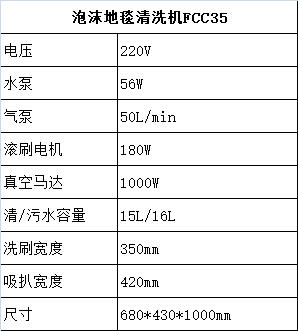 FCC35泡沫地毯清洗机,制泡、滚刷、吸干三合一。快速干燥和一流的清洁性能,确保地毯可立即投入使用。配合C-4地毯高压抽洗机做彻底清洗,能满足持续地毯维护的需求,并持久提供美观清洁的地毯。