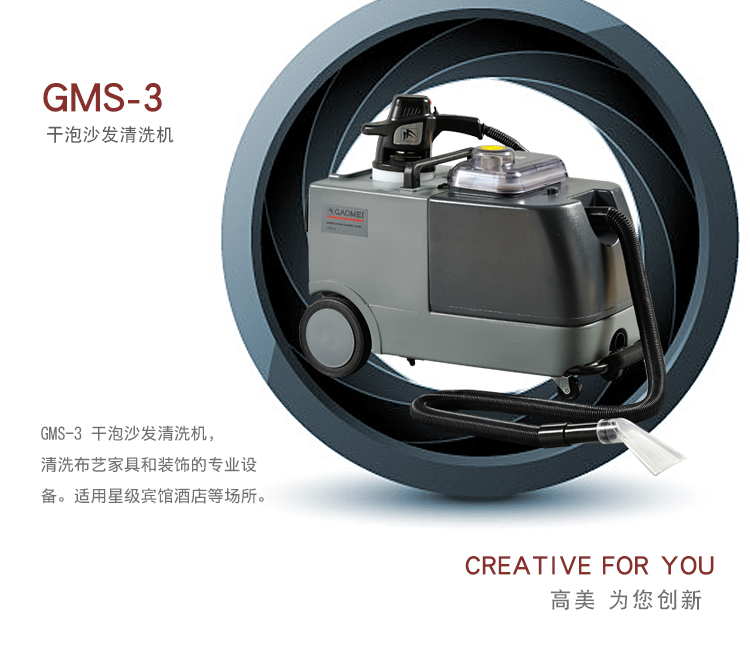 GMS-3干泡沙发清洗机,融入专利发泡技术(ZL032212437 ),泡沫制造,电动刷洗、真空抽吸三合一,是清洗各种布艺家具和装饰的专业设备。配用清洁剂:干泡地毯水,地毯除渍剂,化泡剂。
